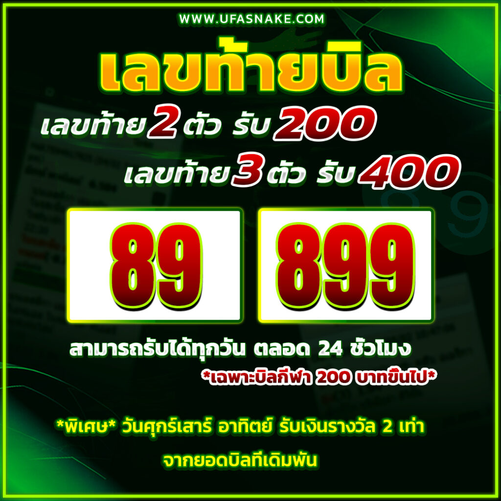 กิจกรรมเลขท้ายบิล กิจกรรมเลขท้ายบิลให้โชค เงื่อนไขการเล่นกิจกรรม 1. เฉพาะสมาชิก UFASNAKE เท่านั้น2. เฉพาะบิลกีฬาเท่านั้น ค่าน้ำ 1.6 ฟุตบอล หรือ 0.6 มวย (บิลฟุตบอลจะต้องเป็นบอล 90 นาที บอลสด สูงต่ำ เท่านั้น)3. ทำยอดเทิร์น 3 เท่า ศุกร์ เสาร์ อาทิตย์ รับ 2 เท่าของราคาบิล (ยอดเทิร์นนับบอลก่อนการแข่งขัน 90 นาทีเต็มเท่านั้น)4. เลขบิลตรง 2 ตัวรับสูงสุด 200 บาท รับได้ 5 ครั้ง/ยูสเซอร์/วัน5. เลขบิลตรง 3 ตัวรับสูงสุด 400 บาท รับได้ 5 ครั้ง/ยูสเซอร์/วัน หากเลขท้ายบิลของคุณลูกค้าตรงกับเลขนำโชคติดต่อรับโบนัสที่แอดมิน แจ้งรับได้ตลอด 24 ชั่วโมงค่ะ(การตัดสินของทีมงานถือเป็นสิทธิขาด ) สอบถามรายละเอียดเพิ่มเติมได้ที่LINEID: @USNAKE1